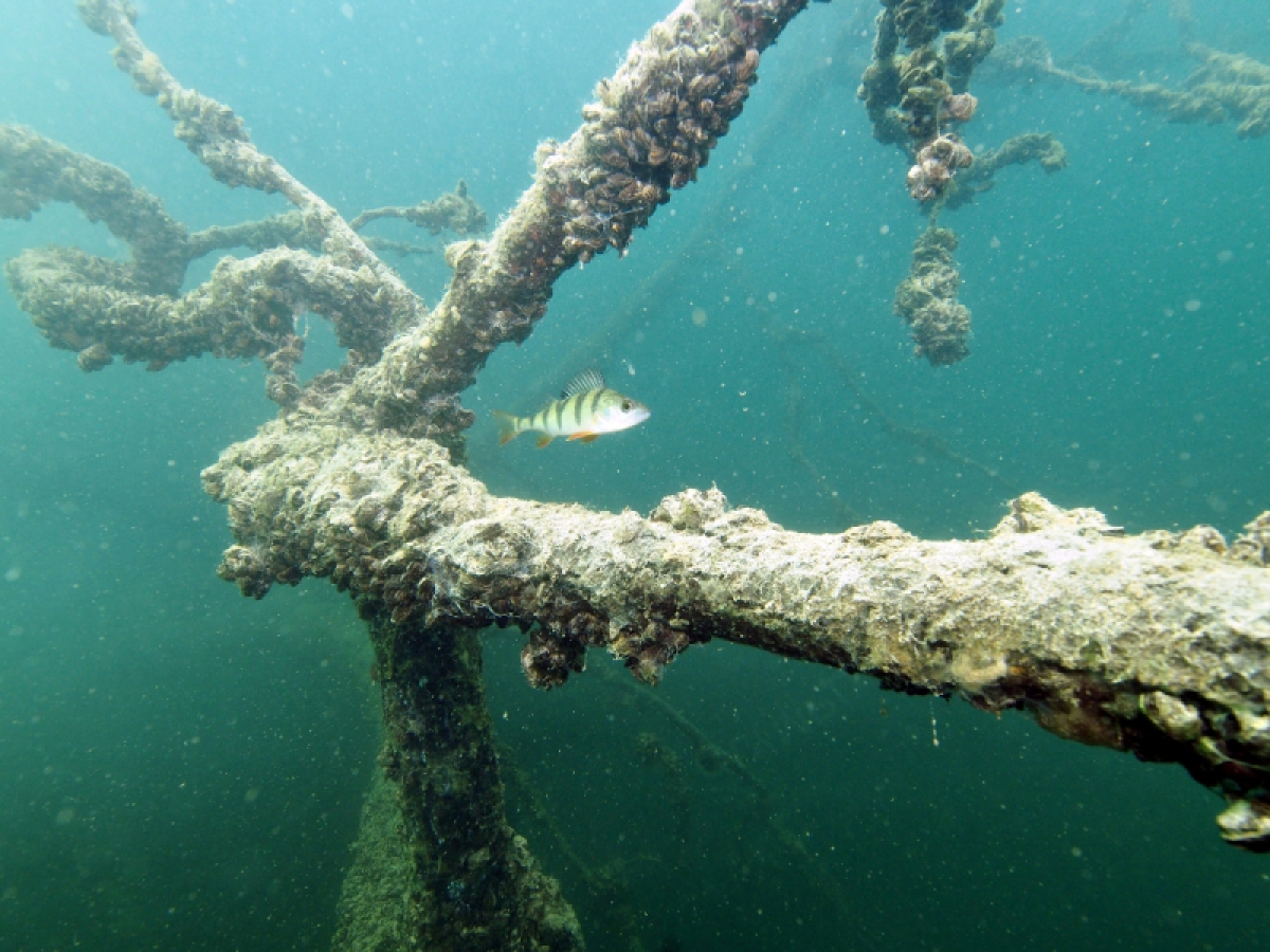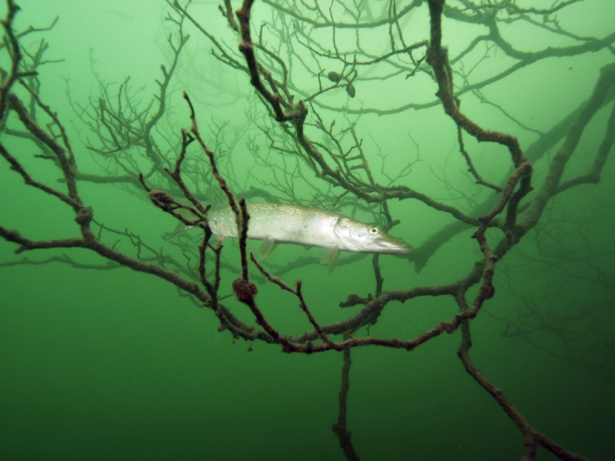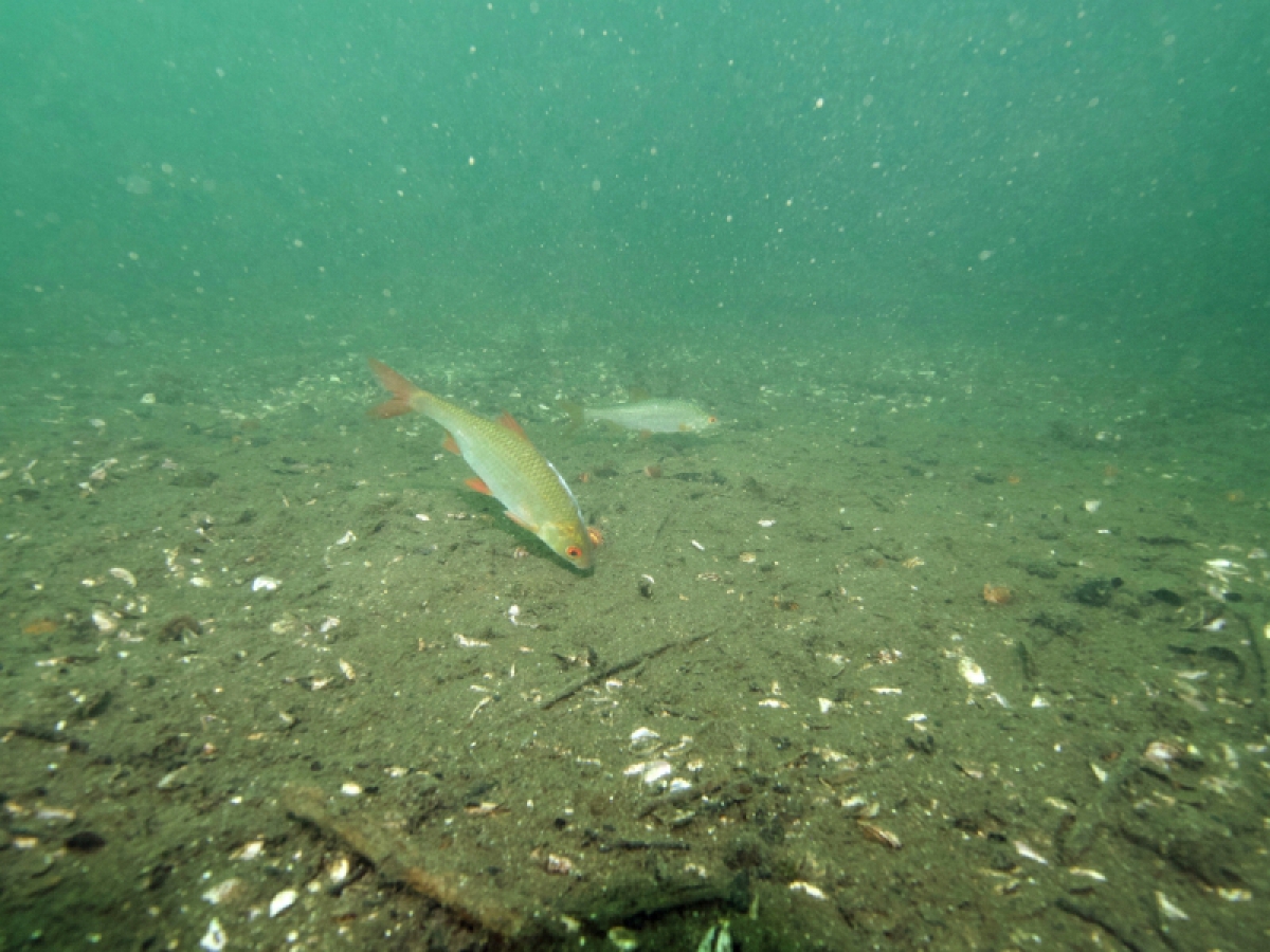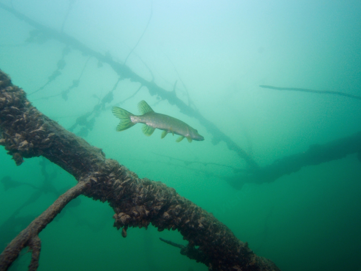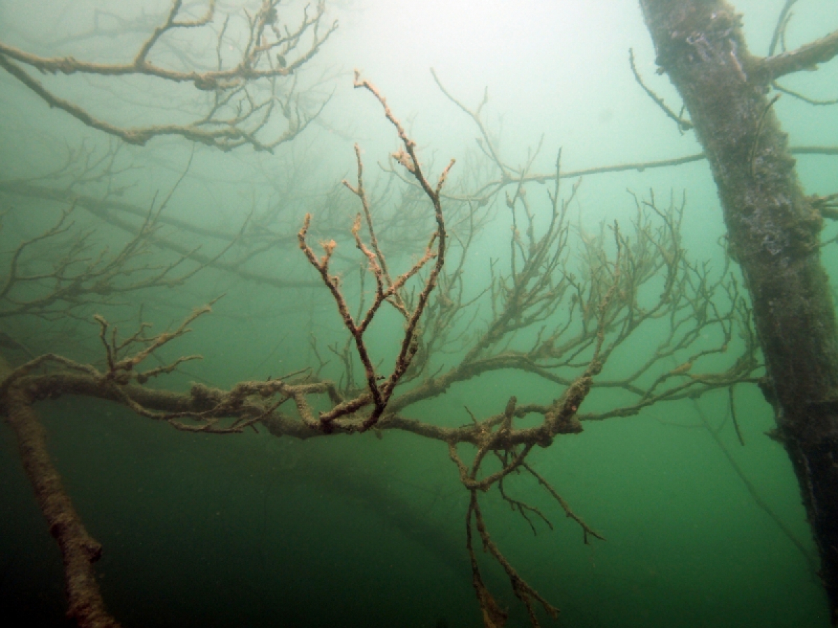 Wejście od strony zamku, to na początku dużo śmieci, głównie w formie gruzu. Płynąc na lewo, lub wchodząc zupełnie z lewej strony, również będą śmieci, ale bardzo szybko pojawią się całe drzewa z rozłożystymi konarami, zatopione jakiś czas temu. Pośród nich wiszą w toni szczupaki, przepływają liny i ciekawskie okonie. Powalone drzewa ciągną się na przestrzeni kilkuset metrów od wejście. Trzeba uważać na gałęzie, żeby się nie zaplątać w ferworze podpatrywania ryb. Można tu spotkać gąbki słodkowodne, ślimaki i raki, zakamuflowane w śmieciowisku zalegającym dno. Głębokość do kilkunastu metrów, głównie 4-8 m.